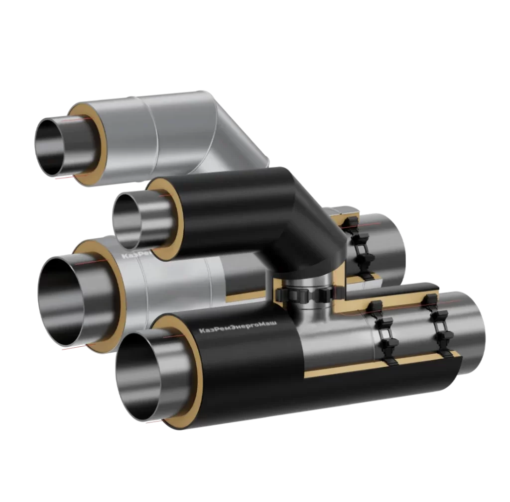 Чтобы разделять или совмещать потоки энергоносителя внутри теплотрассы, используются тройники с параллельным отводом. Боковое ответвление в такой конструкции имеет угол поворота 90 градусов, соответственно патрубок расположен параллельно основной трубе. Такие тройники, как и все стальные трубы с ППУ изоляцией, подразумевают под собой ту же технологию производства.